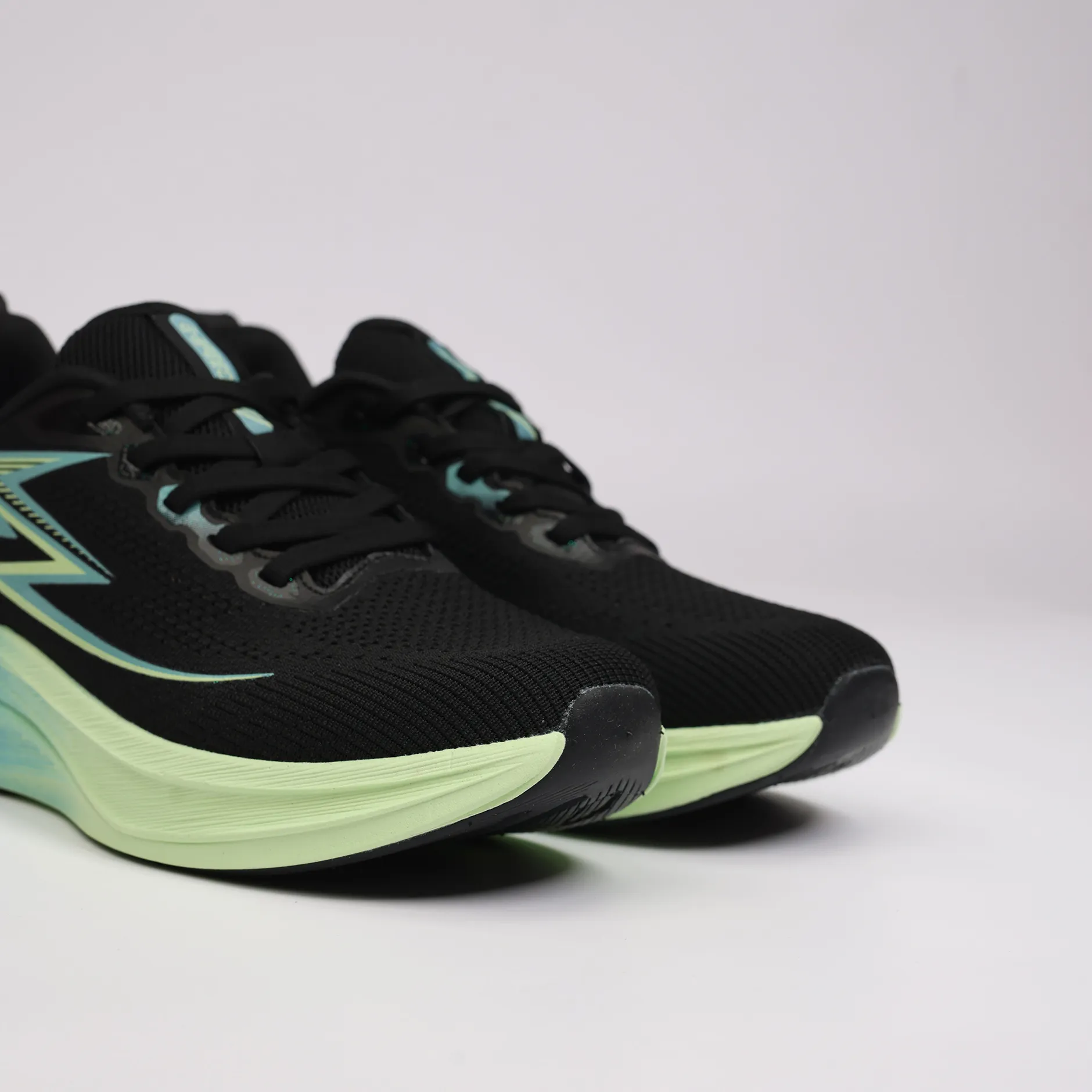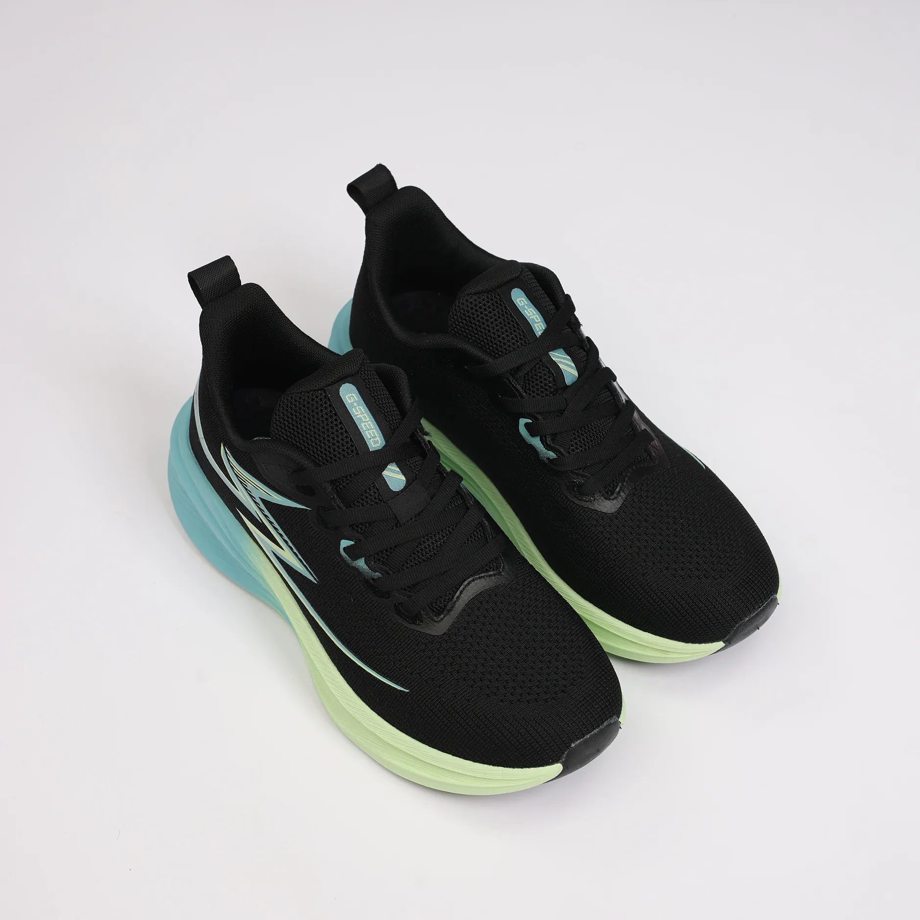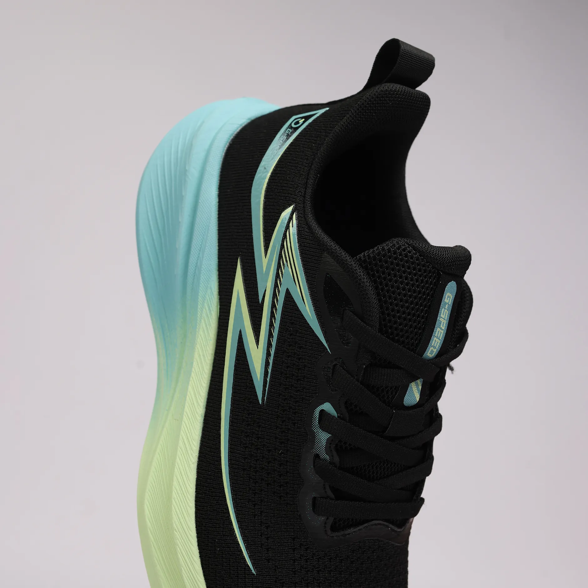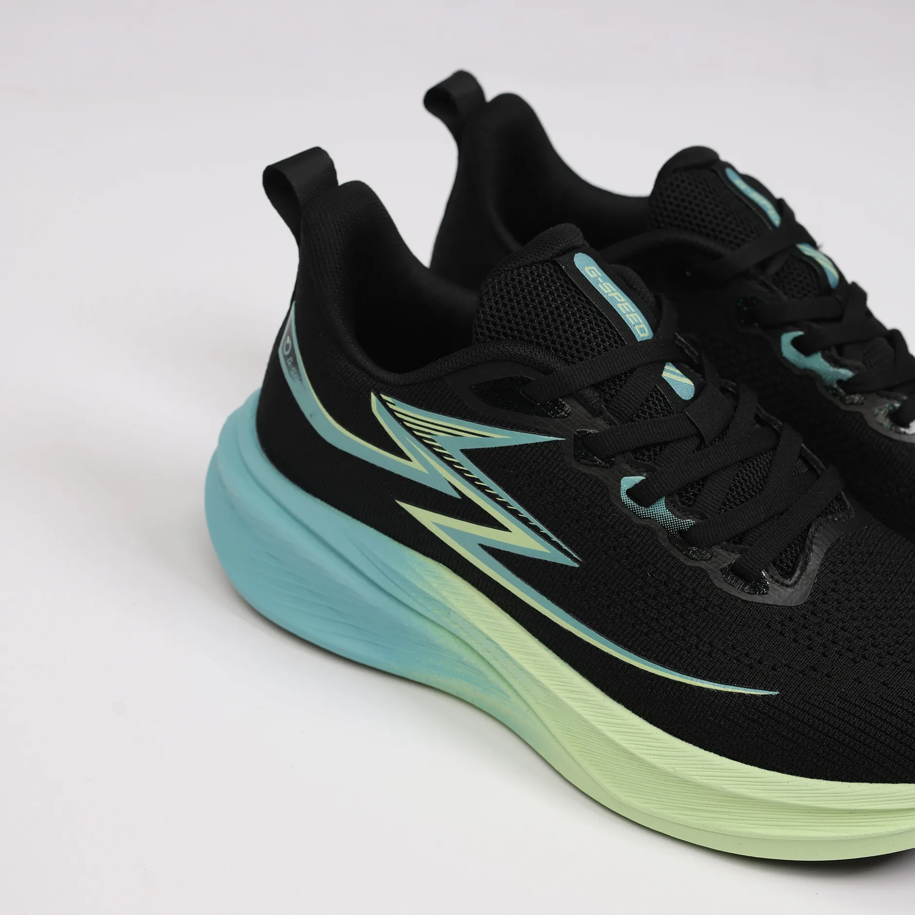 La GSpeed AeroBolt – Neon Breeze mise sur un contraste moderne entre le noir profond et le vert mentholé. Sa tige technique assure une ventilation continue, combinant légèreté et maintien.