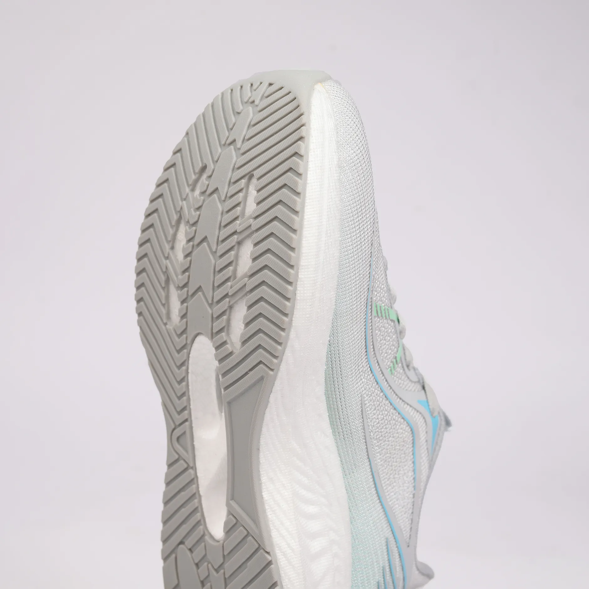 La semelle intermédiaire, dotée d’un amorti généreux et souple, favorise une absorption efficace des chocs et une transition naturelle à chaque pas. Les touches de bleu et de vert pastel, subtilement dégradées, renforcent la dynamique visuelle du modèle tout en soulignant son identité sportive et moderne.