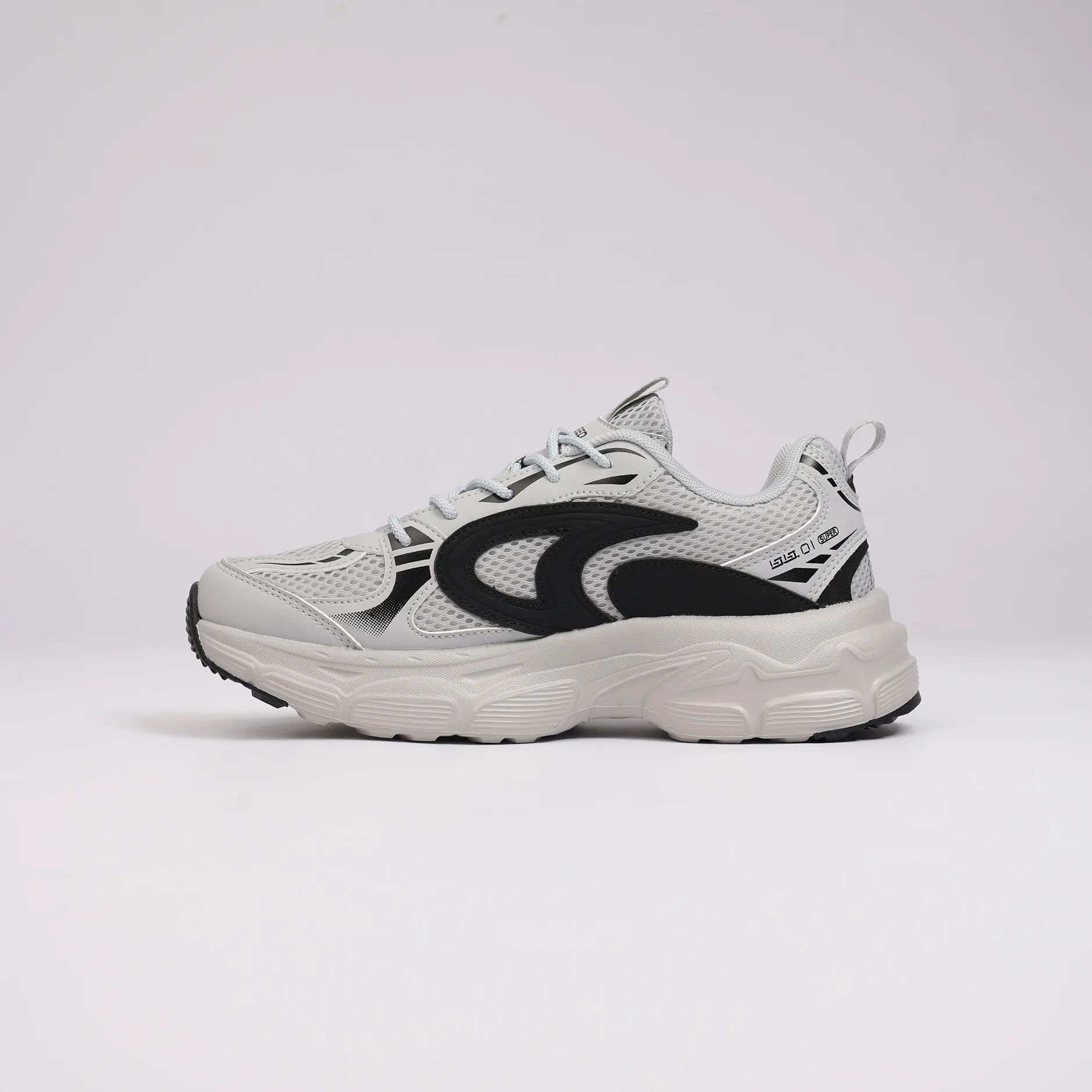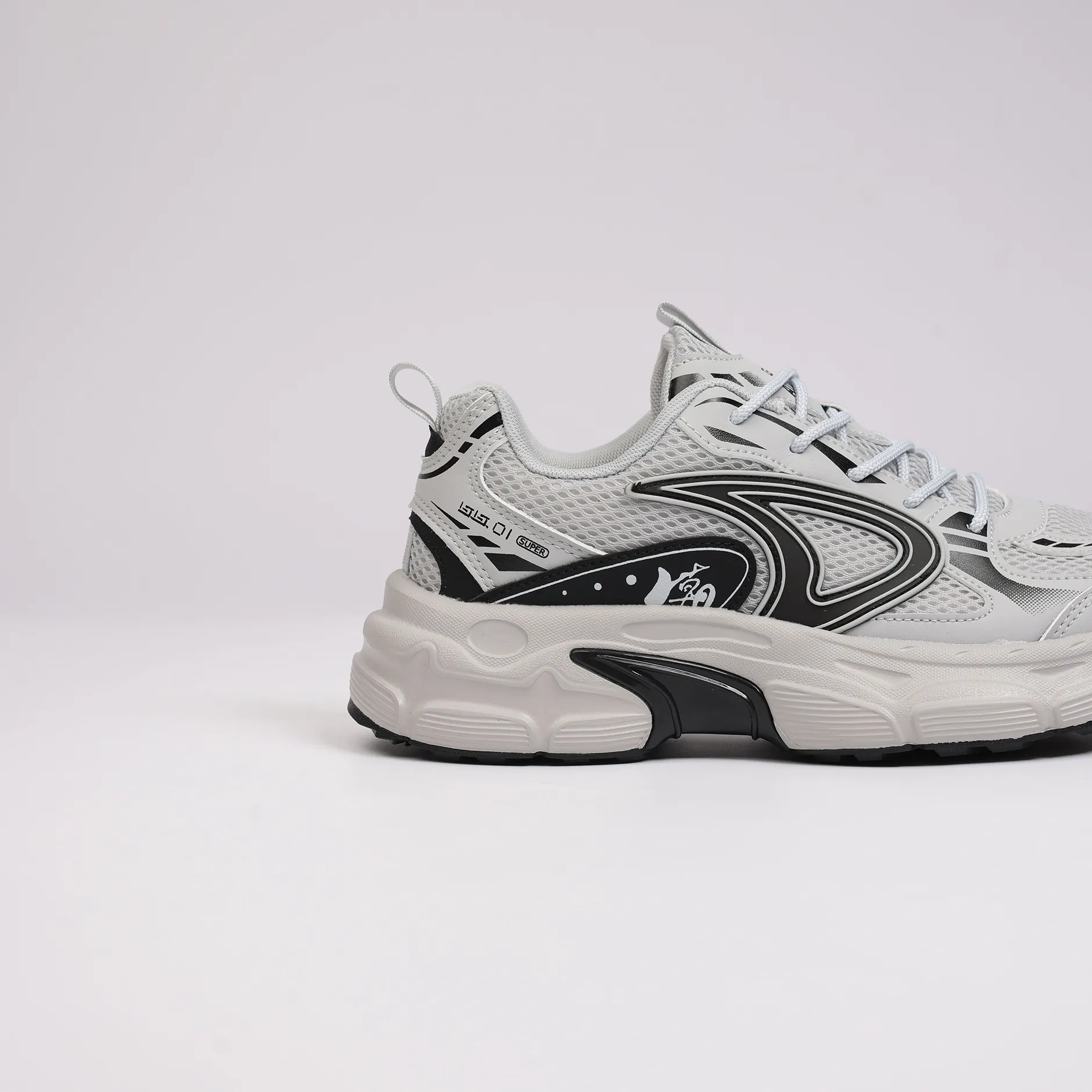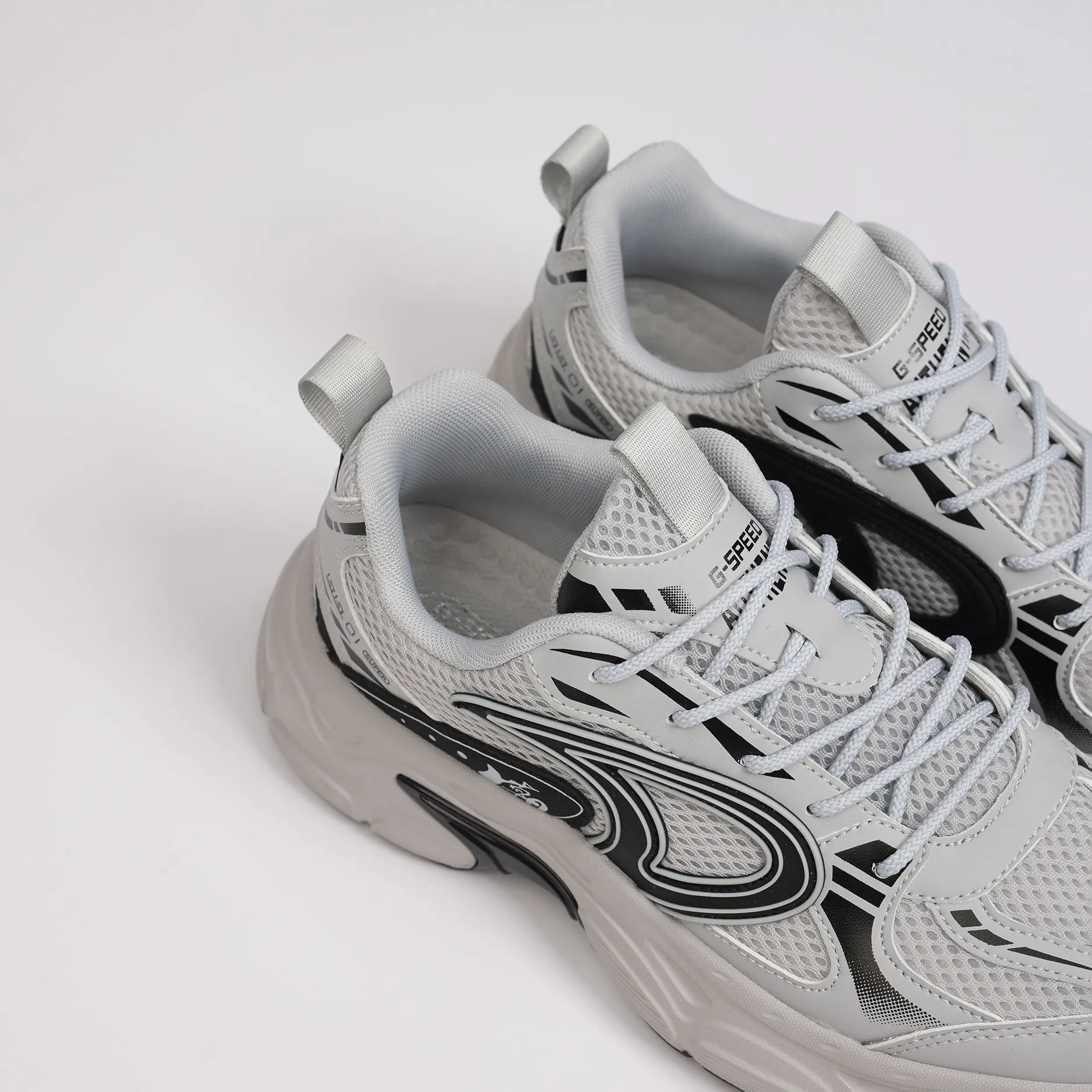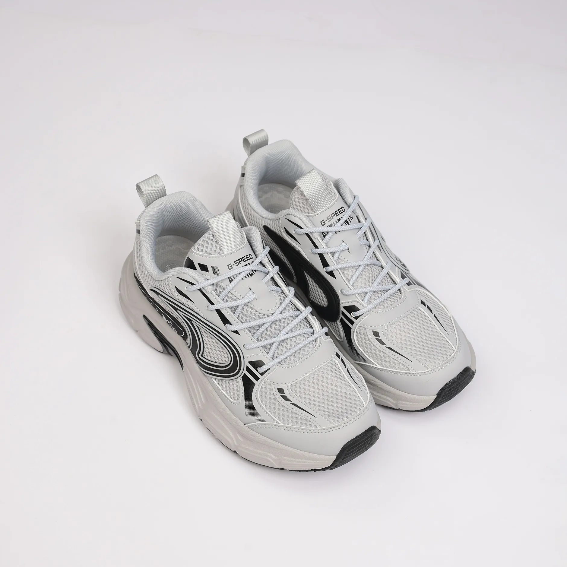 La GSpeed TrailNova 01 – Ice Steel combine une palette claire et moderne avec la performance d’une semelle trail volumineuse. Sa tige en mesh gris blanc assure une respirabilité optimale, tandis que les éléments noirs contrastés soulignent son design dynamique.