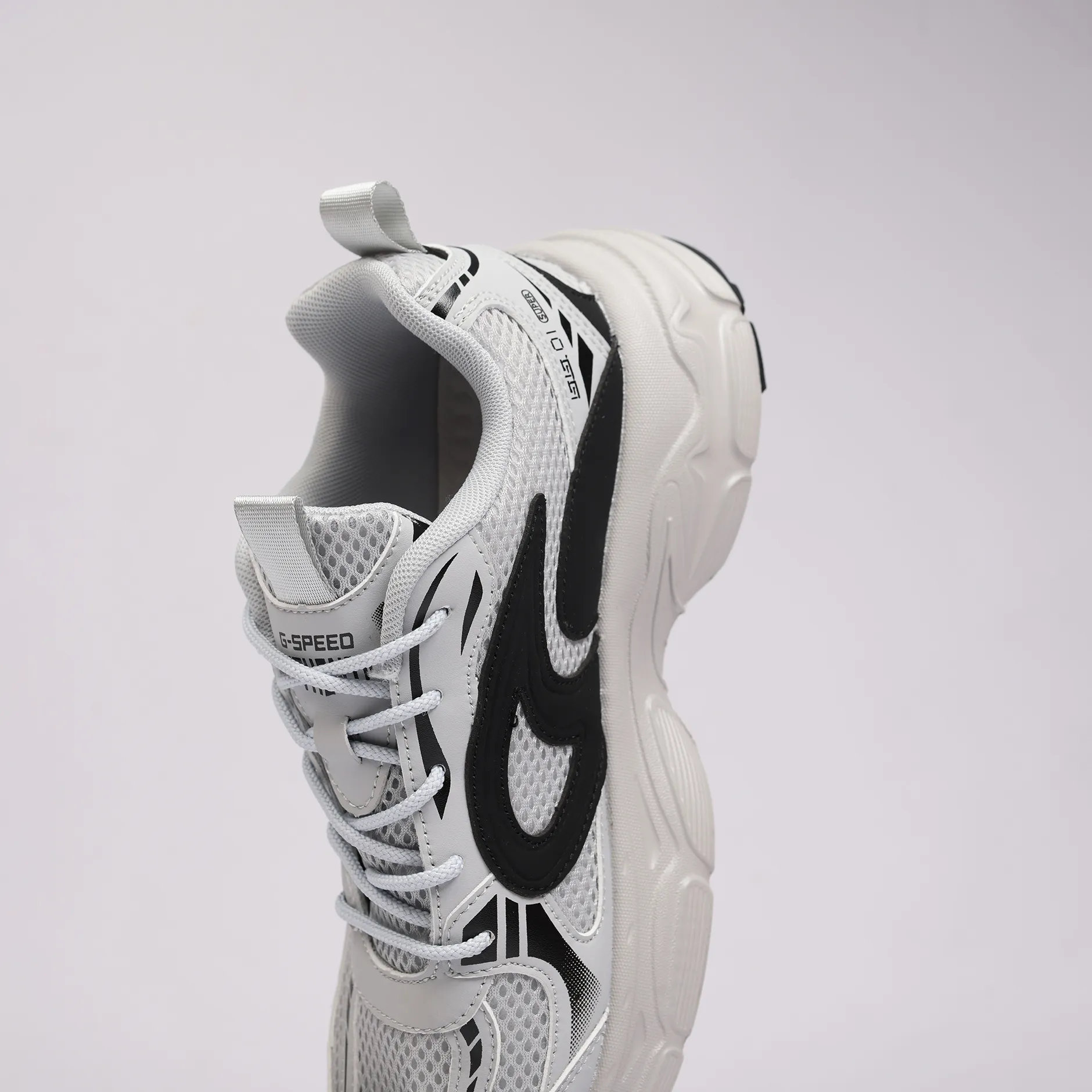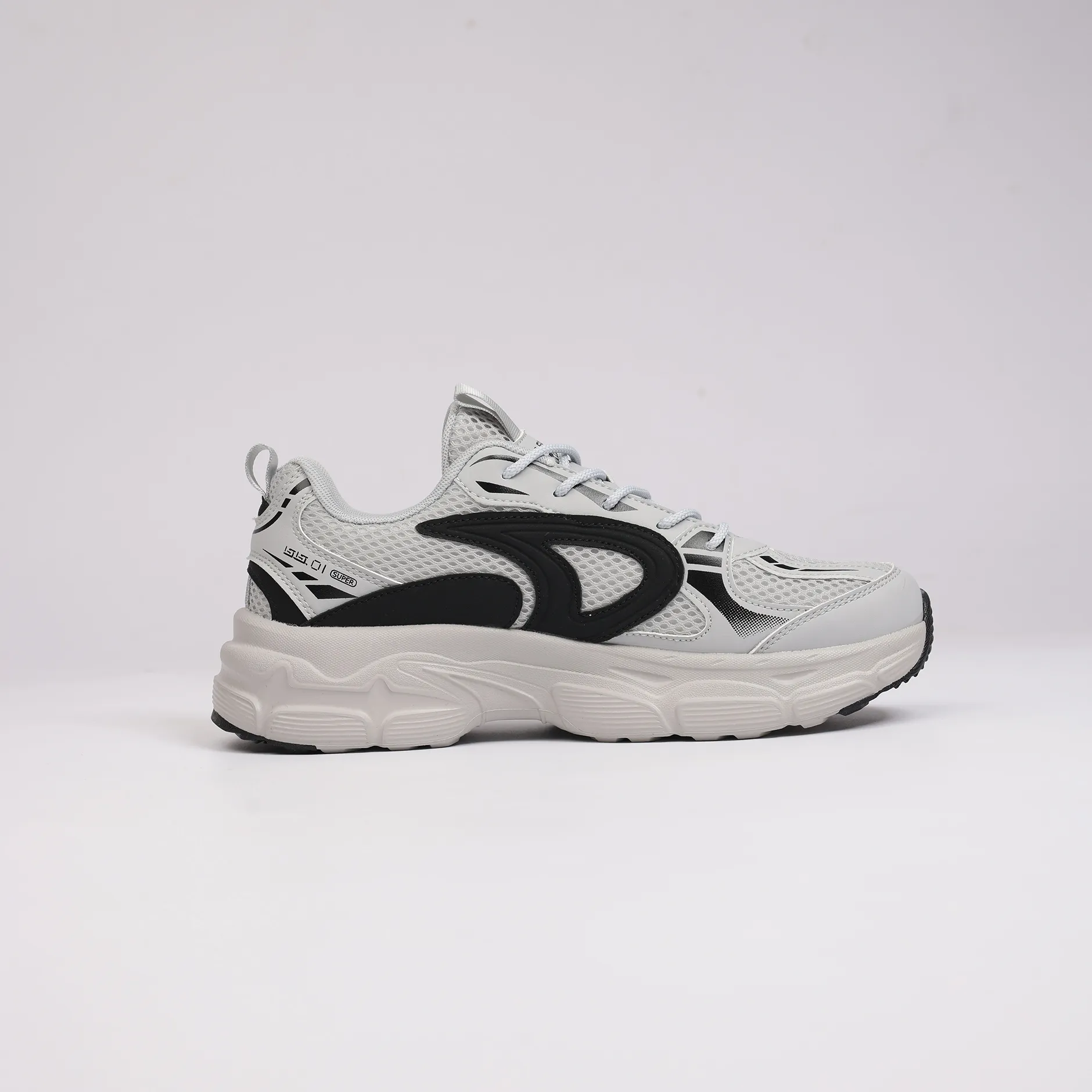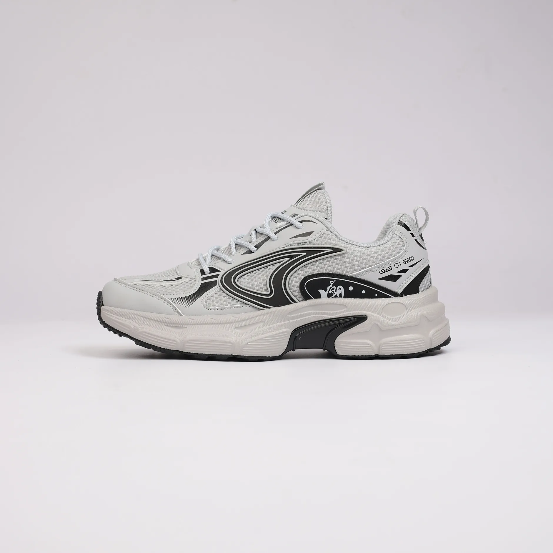 La GSpeed TrailNova 01 – Ice Steel combine une palette claire et moderne avec la performance d’une semelle trail volumineuse. Sa tige en mesh gris blanc assure une respirabilité optimale, tandis que les éléments noirs contrastés soulignent son design dynamique.